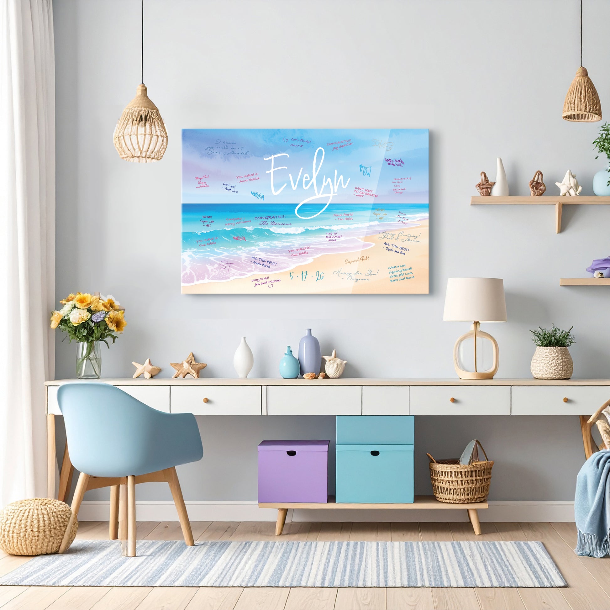 Celebrate in style with this personalized beach-themed guestbook sign-in board, perfect for birthdays, mitzvahs, or any coastal-inspired event. Guests can leave heartfelt messages on this stunning ocean backdrop keepsake featuring your name and special date.. A keepsake guests can help create—made just for her unforgettable day!. It's the perfect blend of beauty and meaning—letting your loved ones leave messages that last a lifetime. It is expertly printed on 1/4" Acrylic, providing a crisp modern aesthetic. Second Surface Printing separates your custom art from the signature layer. Comes with integrated float hanger hidden on the back making it a breeze to display after your event. No worry guarantee :) We can share your art for approval BEFORE I send anything to production. Just ask!