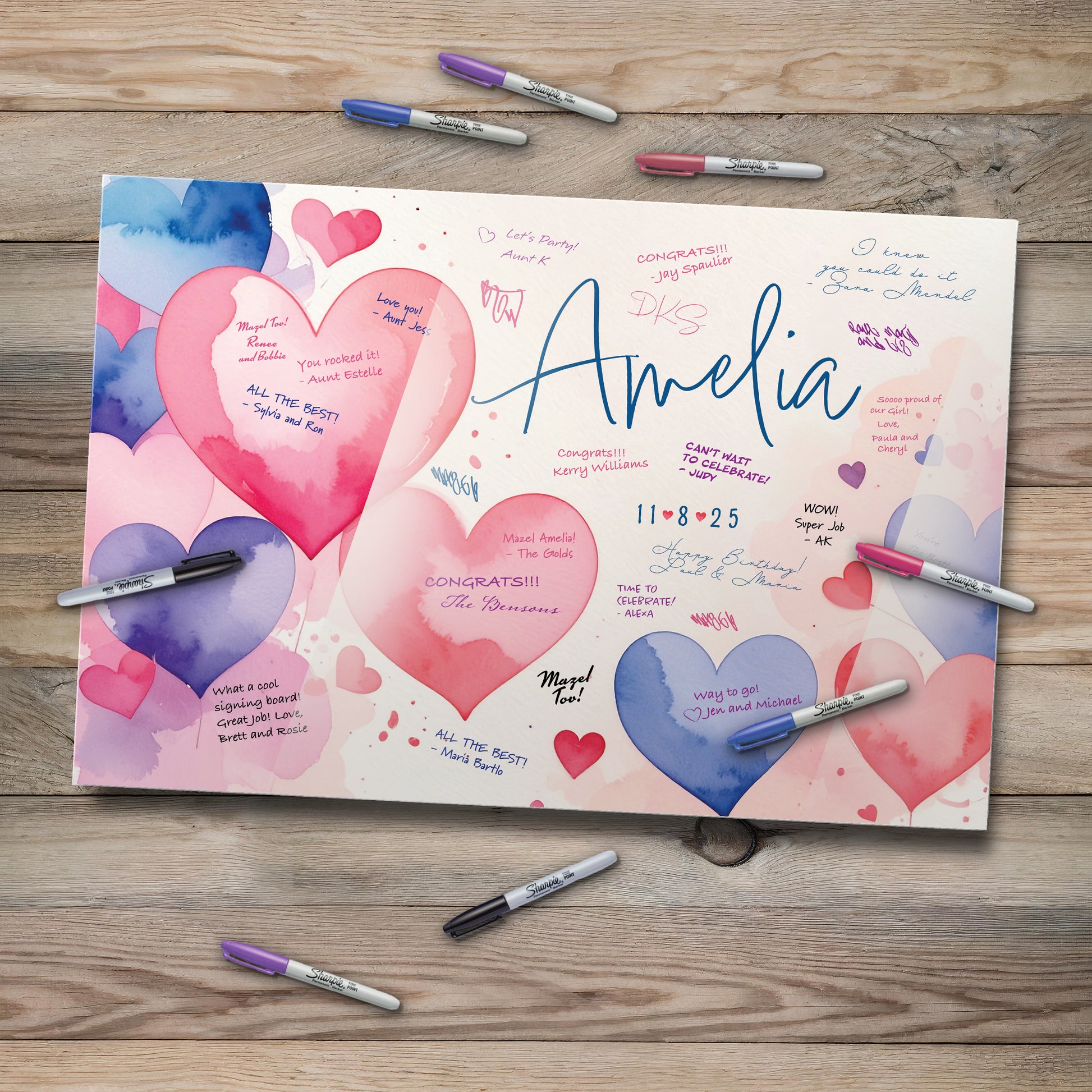 Capture love and well-wishes with this personalized heart-themed signing board, perfect for birthdays, weddings or any milestone event. A keepsake guests can help create—made just for her unforgettable day!. It's the perfect blend of beauty and meaning—letting your loved ones leave messages that last a lifetime. It is expertly printed on 1/4" Acrylic, providing a sleek modern aesthetic. Second Surface Printing separates your custom art from the signature layer. Comes with integrated float hanger hidden on the back making it a breeze to display after your event. No worry guarantee :) We can share your art for approval BEFORE I send anything to production. Just ask!