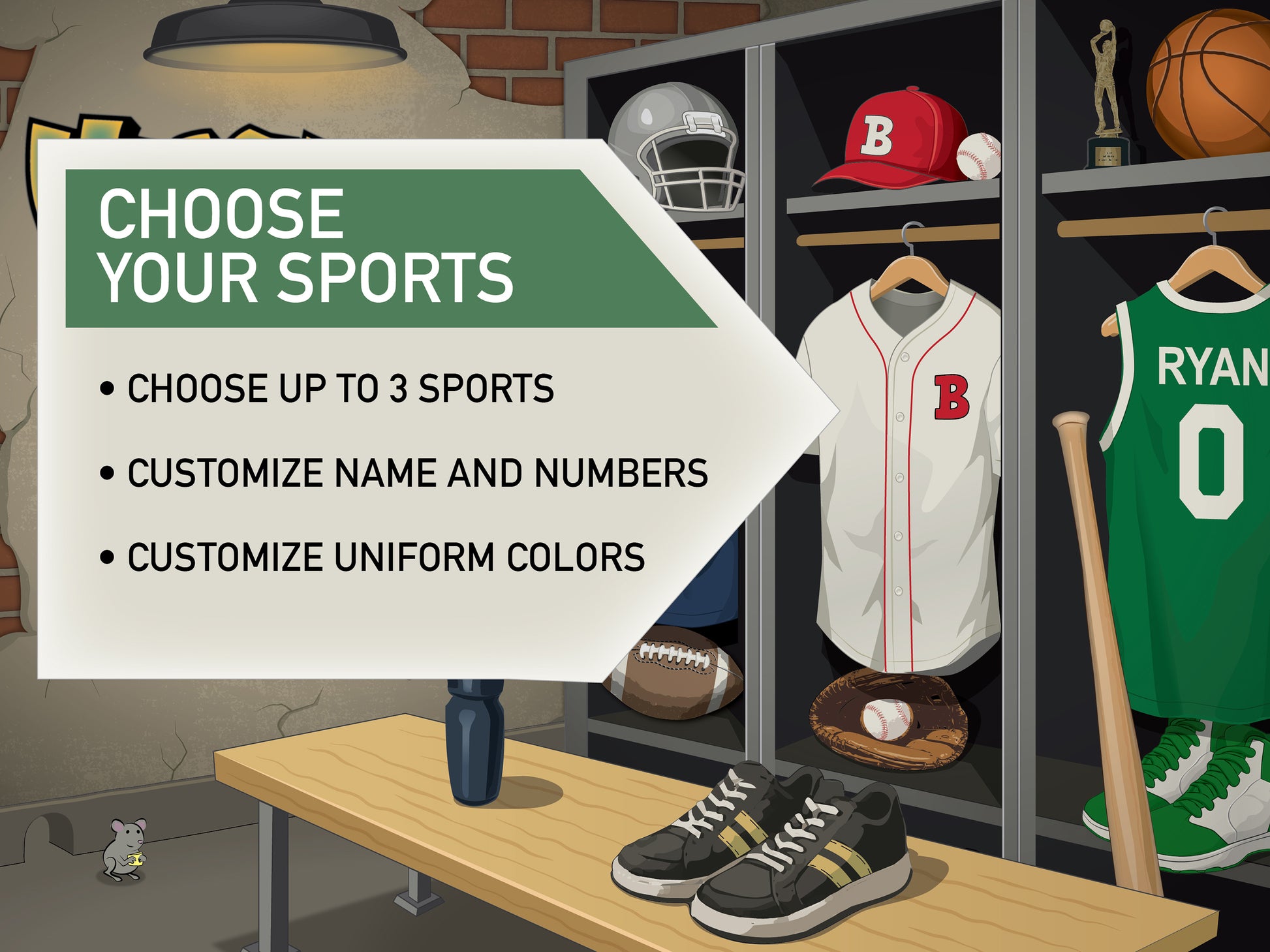 The Locker Room — Personal, inspirational and one-of-a-kind. This bespoke piece makes the perfect customized piece for the kid who lives and breathes sports—and the parents who want their rooms to inspire. Your vintage locker room features your choice sports, names, numbers, and uniform colors. We can even change the primary wall message (ideas below) and select decals (Decals require at least one closed locker). Choose up to 3 sports — Basketball, Football, Baseball, Hockey, Soccer, Golf and more - please ask. Each canvas is perfectly personalized for your MVP, arrives ready to hang on premium stretched canvas and can be framed for that refined touch.